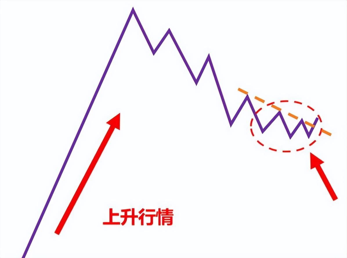 This pattern occurs in an upward trend. When the price pulls back from the top, it begins to enter a converging fluctuation. As the price moves upward, the converging range becomes narrower.