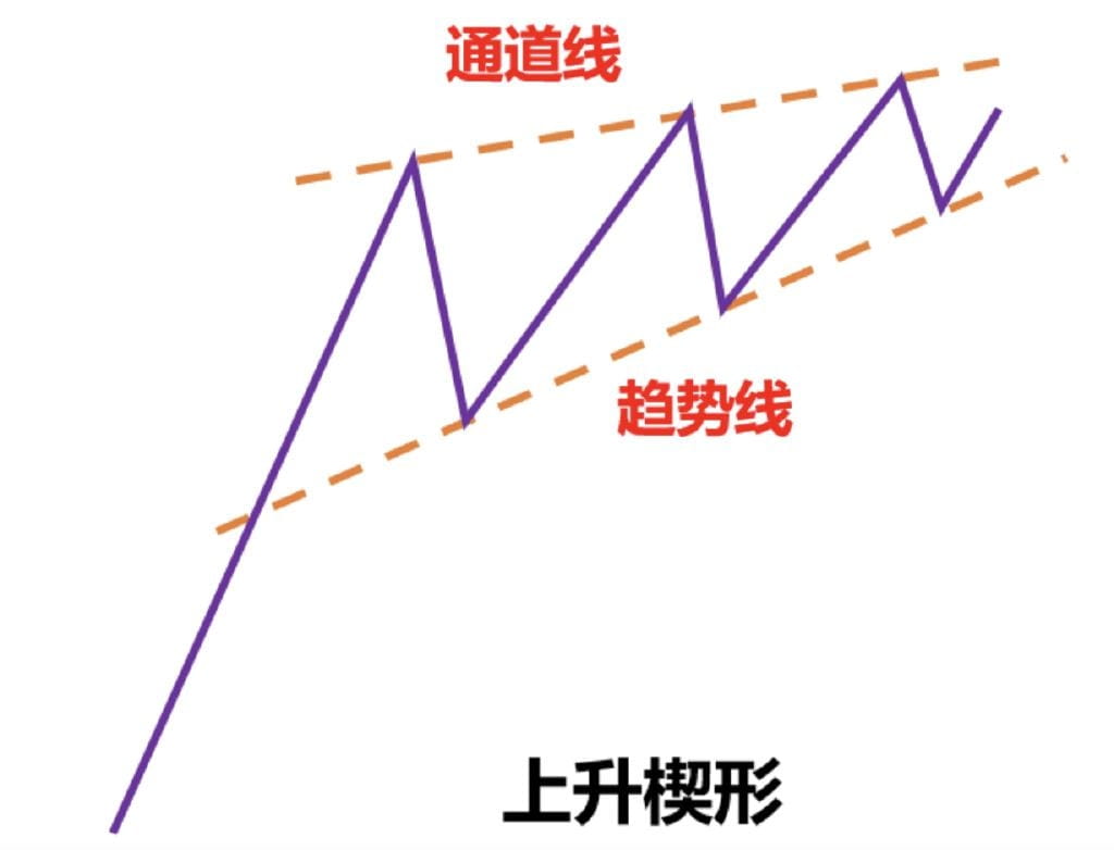Connecting the low points below as the trend line and connecting the high points above as the channel line, generally speaking, in an ascending wedge, the slope of the trend line is much steeper than that of the channel line.