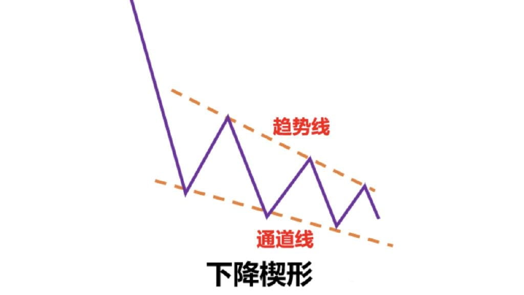 Connecting the low points below as the channel line and connecting the high points above as the trend line, generally speaking, in a descending wedge, the slope of the trend line is much steeper than that of the channel line. This means that the formation speed of lower highs is much faster than that of lower lows, thus forming a wedge pattern.