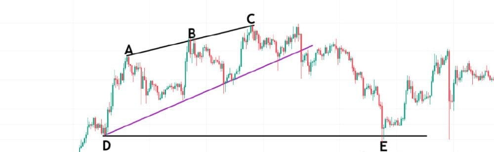 We can see that the figure continuously creates new lows, but the amplitude of the lows is getting smaller. Connecting points A, B, and C forms the channel line.