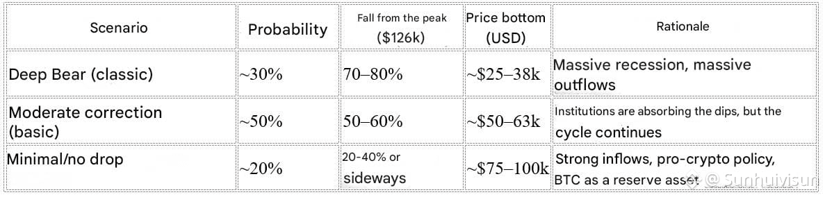Conclusion: A complete absence of a decline is unlikely – the cycle and the current correction (already ~29%) point to a continuation of the bearish phase into 2026. But thanks to institutions, ETFs, and scarcity (inflation ~0.85%), this will be the softest bear in history (at least 50%). If the macro environment improves (Fed cuts, adoption), consolidation and a recovery by 2027–2028 are possible. Monitor ETF flows and on-chain (long-term holders >70%). This is speculative—BTC remains volatile.