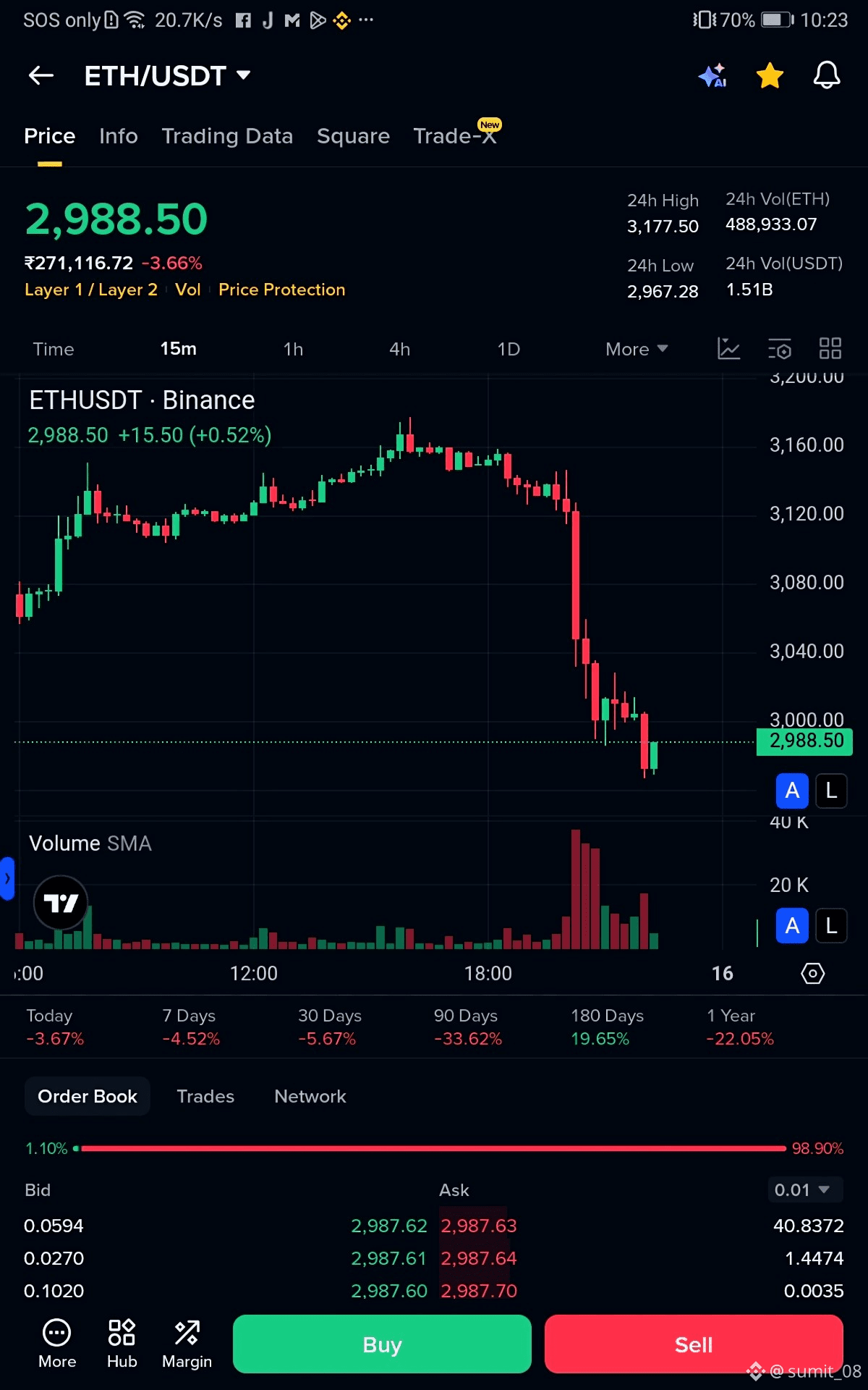 $ETH (ETH) has experienced a sharp sell-off after failing to sustain above the $3,150–$3,170 resistance zone. The price has now dropped to around $2,995, breaking the important $3,000 psychological level, which has triggered panic selling and increased market volatility.