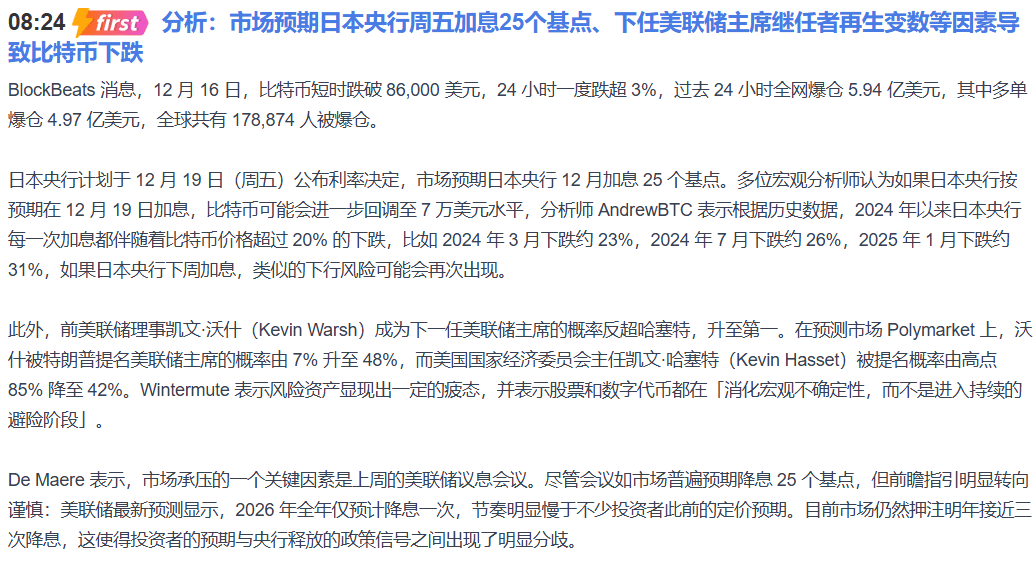 If it really happens, historical data for Bitcoin tells you—every time Japan raises interest rates, BTC tends to drop over 20%! It fell 23% in March, 26% in July, and 31% in January next year... Can ETH stand alone? Difficult!The probability of a change in the Federal Reserve chair has greatly reversed.