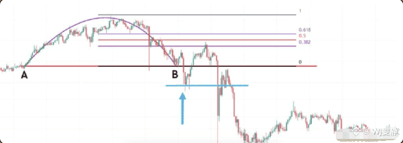 我们发现突破K线后面发生假突破,价格反弹到支撑线上方,但是我们可以看到,价格反弹的区域是颈线到最高点斐波那契的0.382区域附近,随后价格开始下跌。