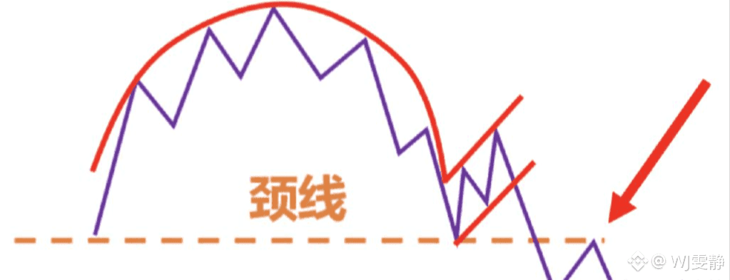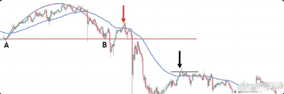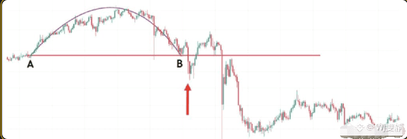 从图中,我们可以看到,通过A点和B点连接,我们可以得到一根颈线,那么激进的交易者就会在红色箭头处的K线跌破以后就进场了。