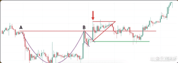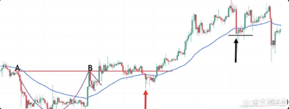 从图中,我们可以看到,通过A点和B点连接,我们可以得到一根颈线,那么激进的交易者就会在红色箭头处的K线突破以后就进场了。