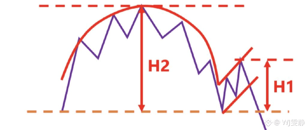 这里有一个非常重要的点,和看涨杯柄一样,就是手柄必须小于杯形,而且颈线到手柄底部的距离不能大于颈线到杯子底部的一半,也就是H1<H2/2,如图3.10-14所示,