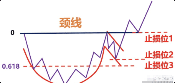 对于看涨杯柄来说,如果是用方法1突破颈线进场,这类交易员一般会将止损位置设置在止损位2的地方,