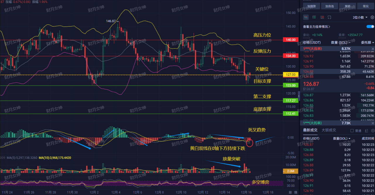 A rebound is just a trap for more buyers. Shorting at highs is the kingly way. Although there are signs of a breakout with increased volume, the volume can't keep up, and it seems more like the main force is luring in buyers to sell. I believe that even if SOL temporarily rebounds to around 130, it is still an opportunity for you to short. The real major support is below, and don't rush to catch the bottom before it's reached!