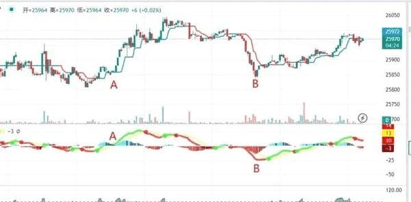As shown in the figure: I will choose to long at point A's peak and also long at point B's peak. But I must remind everyone that MACD can reduce losses to a certain extent. No matter if you are going long or short at the peak, it is definitely more reasonable than blindly entering contracts or only looking at price levels. Because MACD's peaks will only show during the mid to late stages of a downtrend or uptrend, thus your entry price will be much more reasonable compared to other periods.
