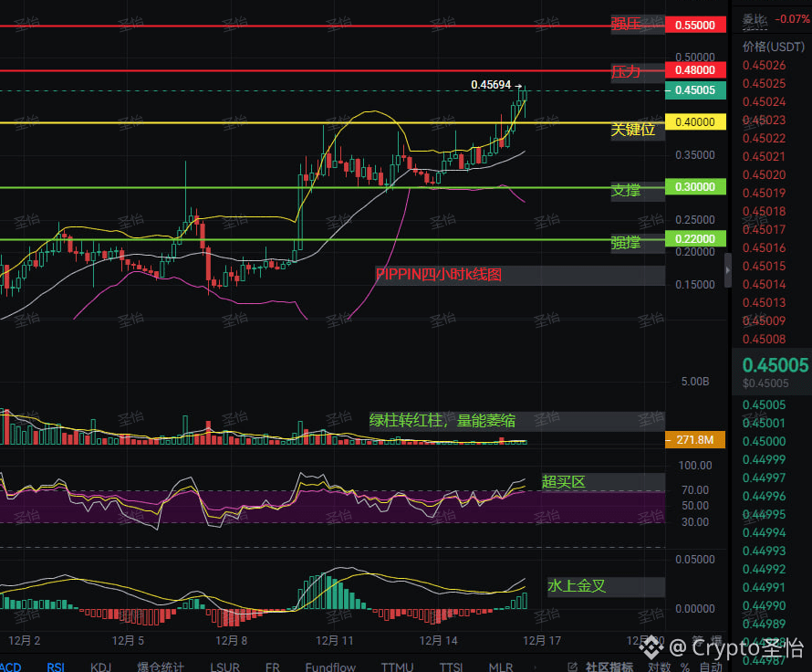 PIPPIN现在卡在0.44附近,上面第一个压力在0.48,再往上就是0.55。从四小时图看,MACD黄白线在水上金叉,整体还是多头趋势,这说明短期还有冲高的动能。但如果量能跟不上,小心冲高回落! 我预感0.48附近会有一番激烈争夺,这里如果能突破,0.55或许真有戏。