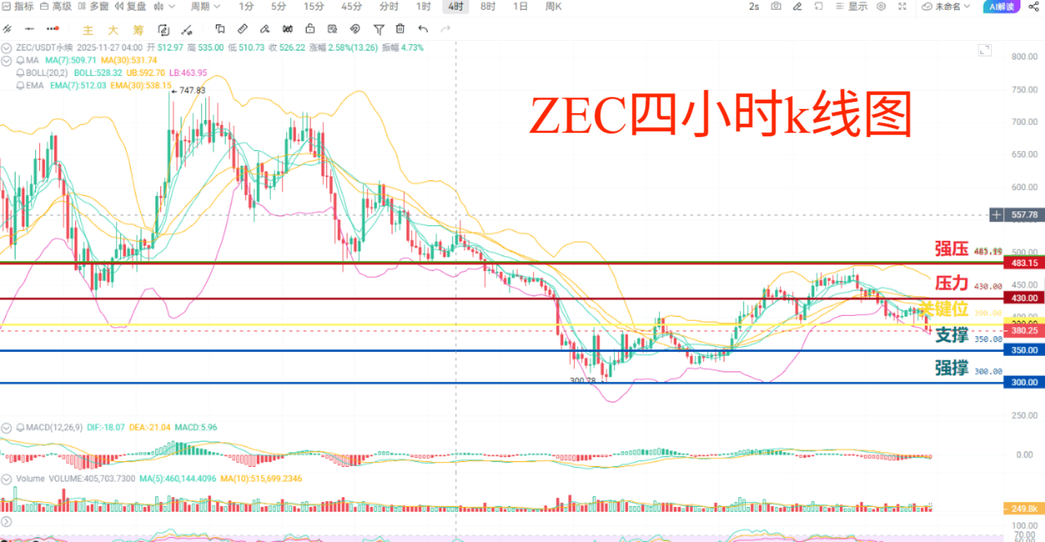 ZEC has broken through the important level of 390 on the four-hour chart! The price is now hovering around 380, and if it doesn't bounce back above 390 before the close, it is likely to drop all the way to the strong support level of 350. The current market clearly shows that bears are in control; every time there is a slight rebound, it's a good opportunity to get out quickly, but don't rush into buying the dip without thinking!