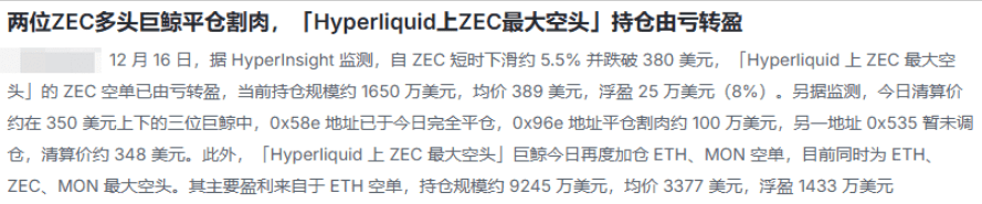 The largest short whale of ZEC has finally made a profit, with a position size of 16.5 million dollars, already gaining 250,000 dollars! There are also two ZEC long whales forced to cut losses and close positions, with one of them losing about 1 million dollars. This indicates that large funds are bearish, and retail investors should not go against the trend!