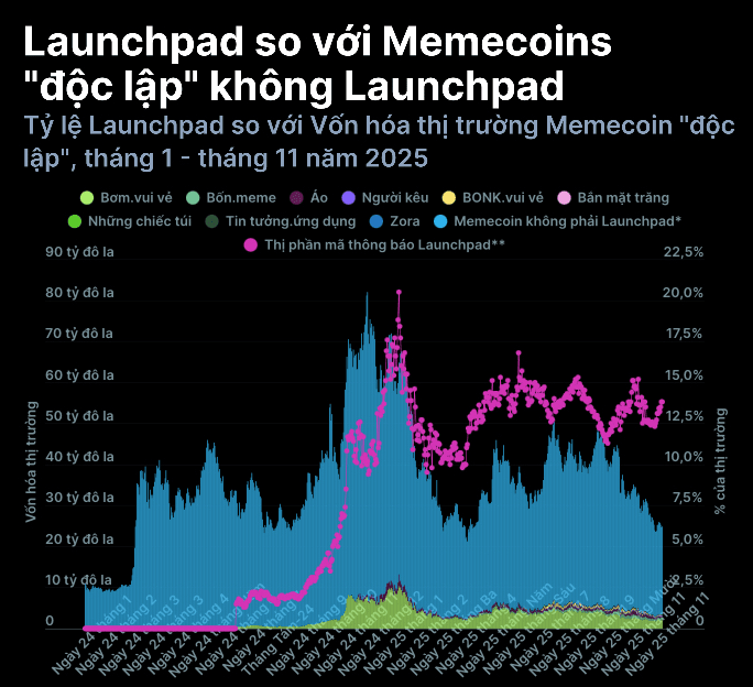 The market capitalization of launchpad-based memecoins increased from 1.5% in July 2024 to a peak of 20.5% in January 2025. The trading volume of newly launched memecoins also rose significantly from an average daily level of $117.6 million in July 2024 to $1.2 billion in November 2025. However, it still only accounts for 20.5% of the total memecoin volume.