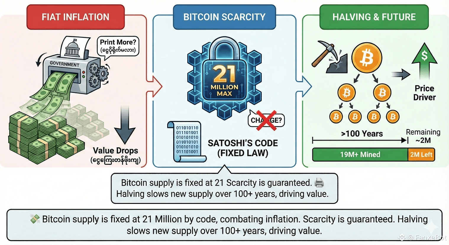 ဒါကြောင့် Bitcoin ရဲ့ ကုဒ် (Code) ထဲမှာကိုက "စုစုပေါင်း ၂၁ သန်းထက် ပိုမထွက်စေရ" ဆိုပြီး တိတိကျကျ ရေးဆွဲခဲ့ပါတယ်။