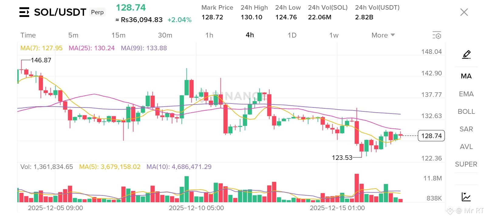 | Current Price vs. MAs | The current price (128.74) is above the MA(7) (127.95) but is below both the MA(25) (130.24) and MA(99) (133.88). | The price is attempting to recover but is meeting strong overhead resistance defined by the mid-term (MA(25)) and long-term (MA(99)) averages. |