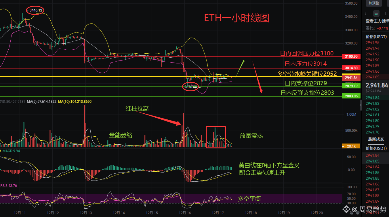 从一小时图看,ETH整体是下跌趋势,但MACD黄白线在0轴下方金叉、缓慢上行,说明短期有反弹动能。关键压力在3014,强压是3100;下方支撑先看2879,跌破的话,2803才是真底。