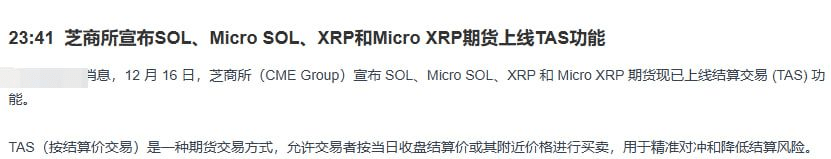 Attention, just now, Wall Street announced a major move: the Chicago Mercantile Exchange suddenly announced that the futures for SOL and XRP are officially launching the TAS function! What does this mean? In simple terms, it means that large institutions can now accurately 'lock in' positions using the closing settlement price, which opens a highway for institutions to enter the SOL market.