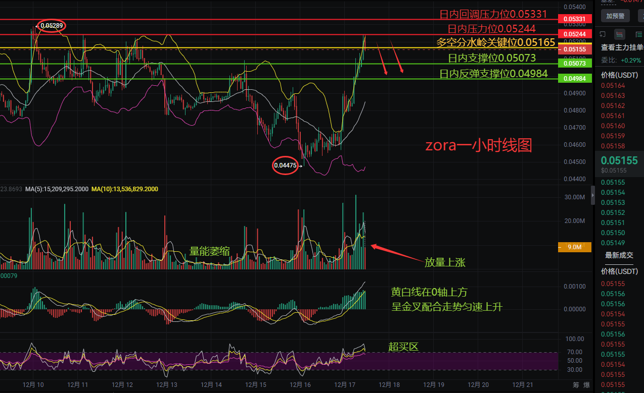 I think ZORA will find it difficult to hold above 0.053 today; it is highly likely to encounter resistance and fall back between 0.05244-0.05331, testing the support at 0.05073. Although the MACD has crossed bullish now, if the volume does not keep up, the drop can be severe.