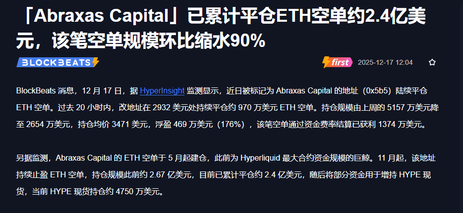 Abraxas Capital's action is a textbook example of 'cleaning up completely.' Starting from May, holding on despite a potential short position of $267 million, they have now closed out $240 million while leaving with significant floating profits. This is not a panic exit; it's a planned and victorious retreat. Especially noteworthy is that they redirected some profits to increase their holdings in HYPE spot, which signals something more intriguing than just closing positions. It suggests that they may have merely switched battlefields, moving from shorting Ethereum to being optimistic about a particular ecological asset.