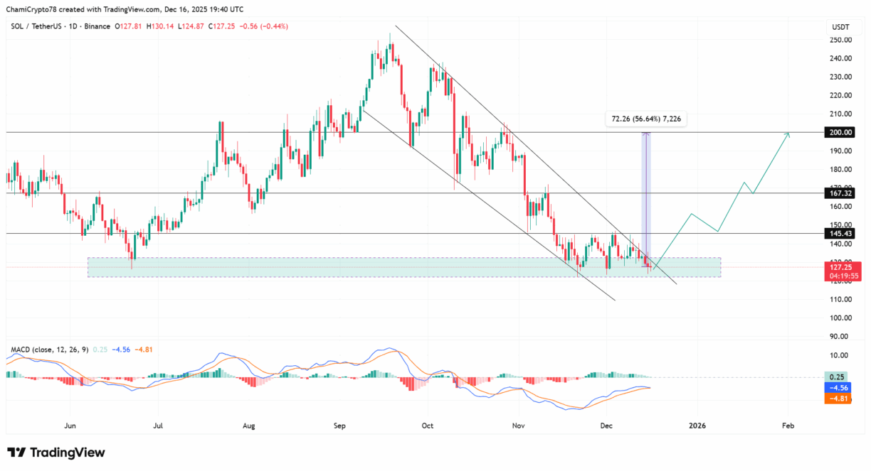 The daily chart shows Solana's price trading within a descending channel formed after the previous cycle's peak.