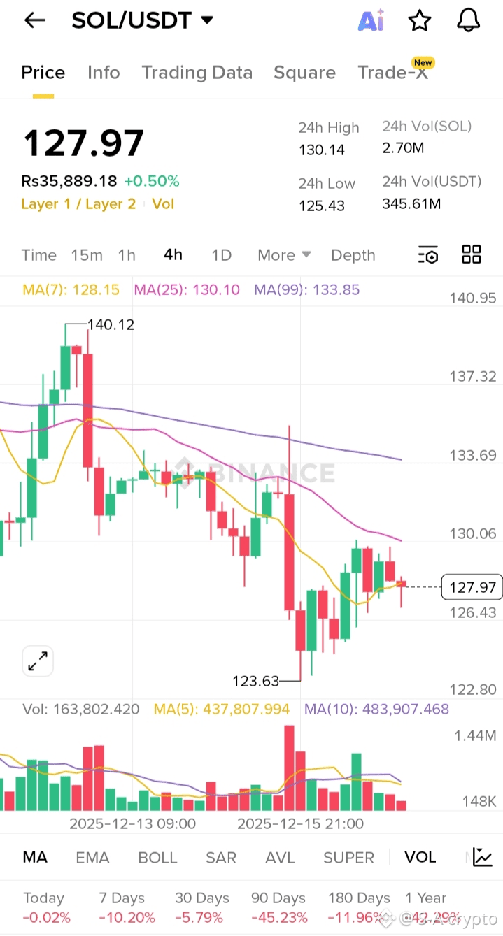 Price is below MA(25) ~130 & MA(99) ~133 → overall bearish pressure.