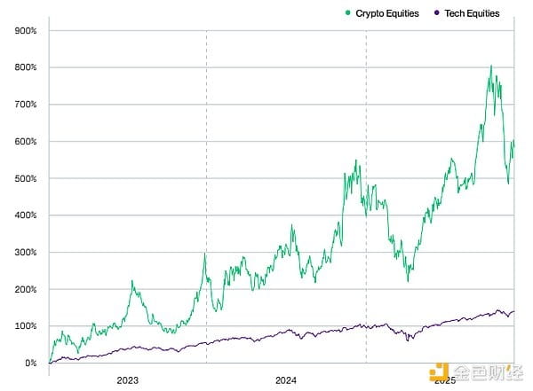 However, investors in cryptocurrency-related stocks are even more delighted. The Bitwise Crypto Innovators 30 Index—composed of listed companies that provide core infrastructure and services for trading, securing, and maintaining crypto assets and their underlying platforms—saw an increase of up to 585%.
