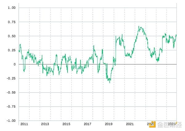 From a 90-day rolling correlation perspective, Bitcoin's correlation with the S&P 500 index rarely exceeds 0.50 (which is the conventional boundary between 'low correlation' and 'moderate correlation' in statistics).