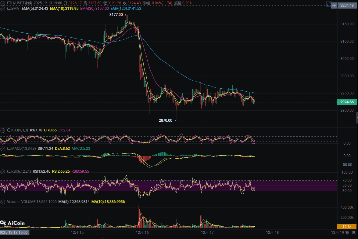 From the main chart, ETH is currently in a phase of low horizontal consolidation after experiencing a significant drop from 3177 to 2870 on December 16. The rebound strength is weak, and it has not formed a 'V-shaped' reversal, which usually means that the bearish force still dominates the market.