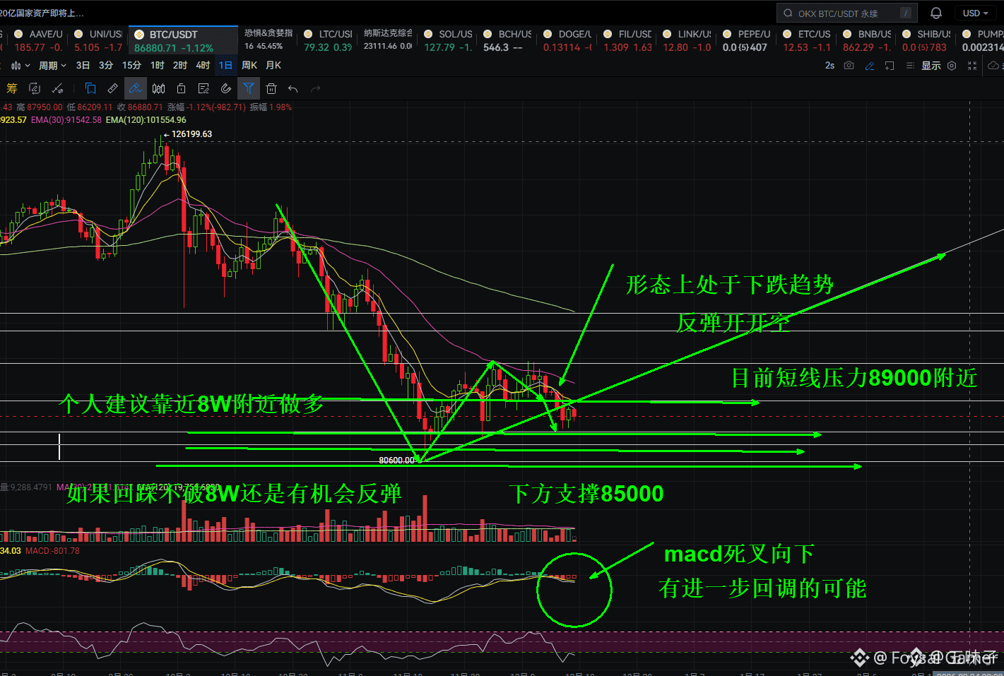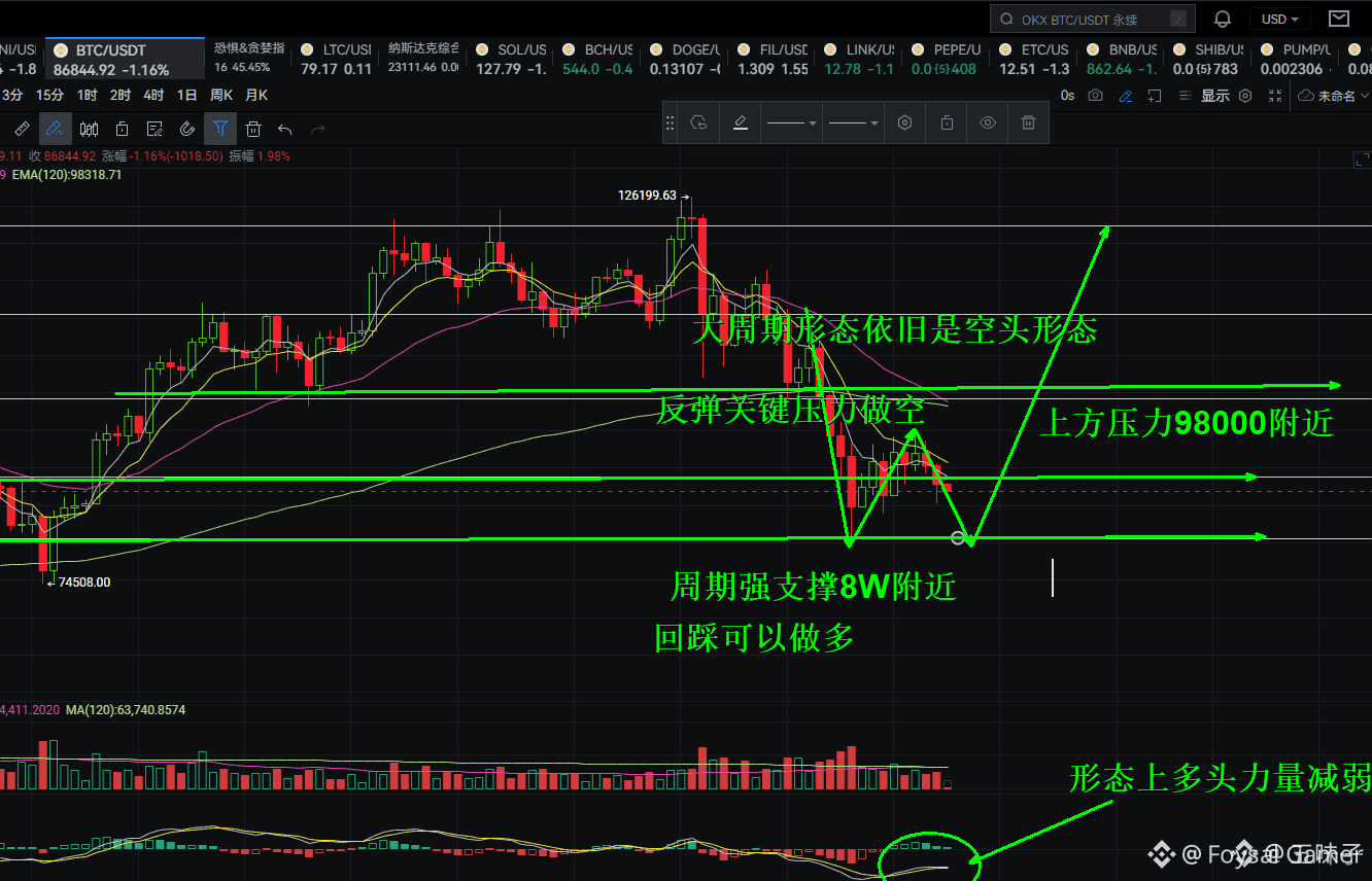 On the 3-day line pattern, MACD shows that bullish strength is exhausted, the long-term trend is downward, and continue to open shorts on rebounds. The upper pressure is around 98000; a retracement near 8W can be long, just set a good stop loss.