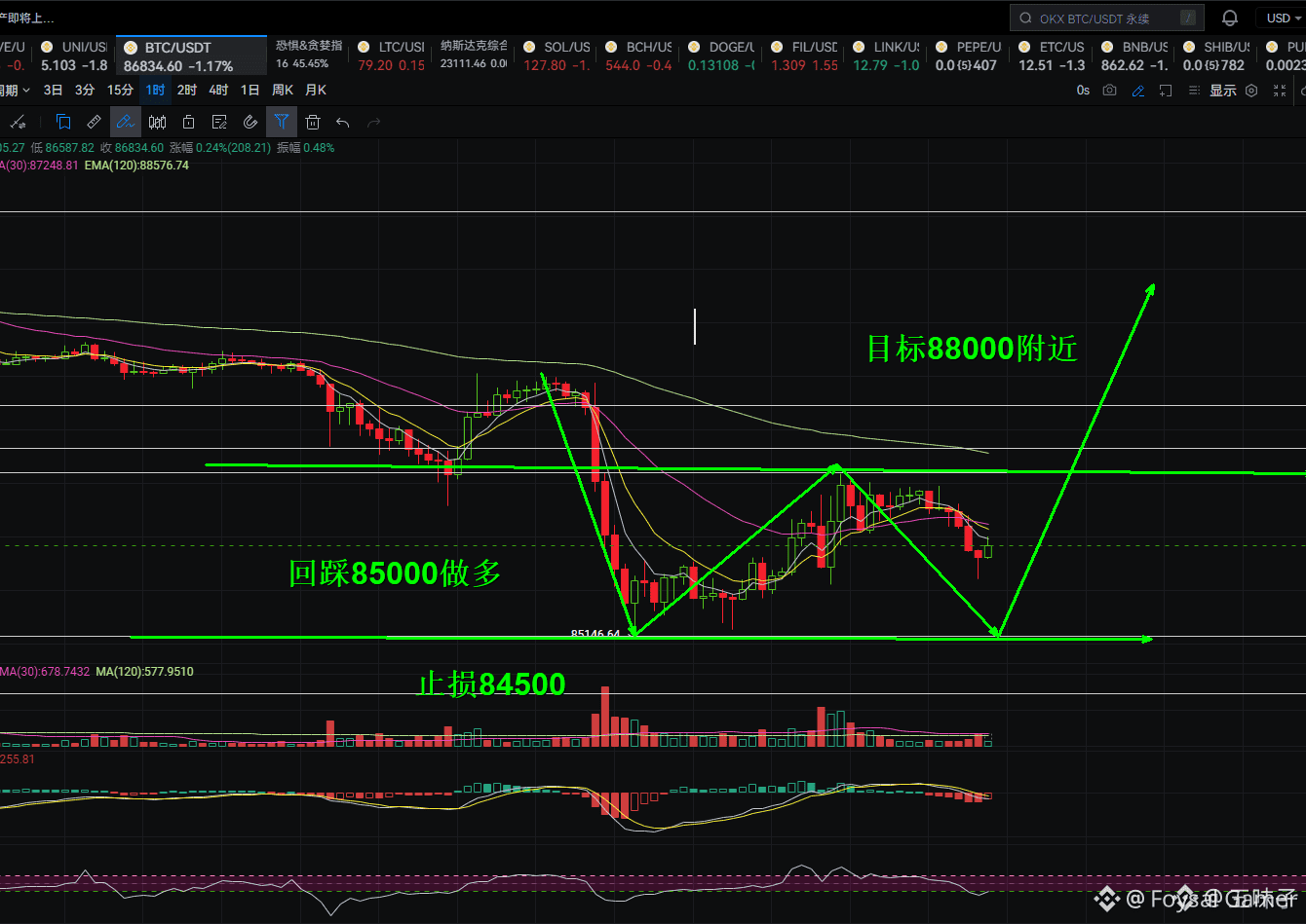 On the 1-hour level, it is recommended to go long near 85000, with a stop loss at 84500 and a target around 88000.