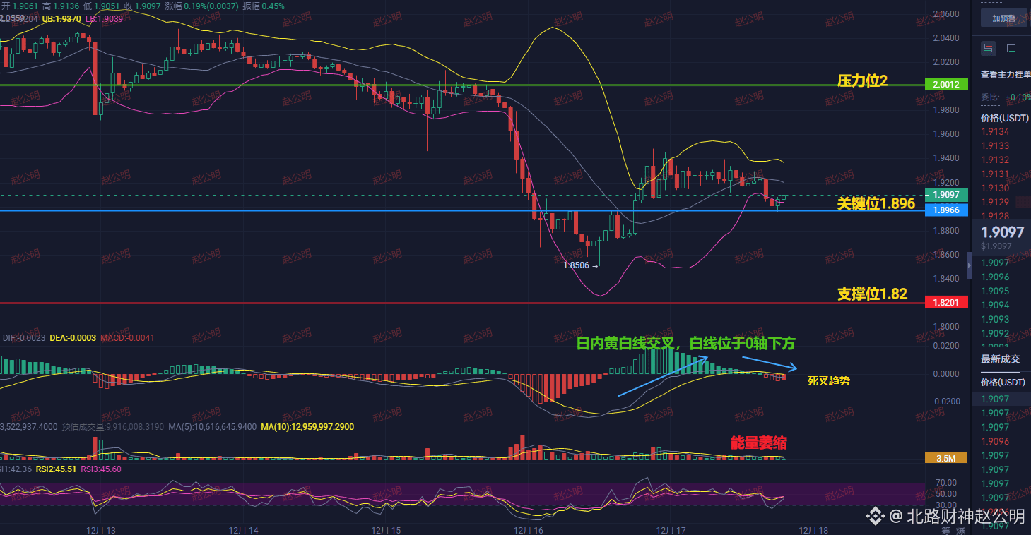 关键位置:2.0是铁顶,1.896是当前生死线。现在价格1.9124,就在生死线边上晃悠。往下1.82支撑看似不远,但一旦跌破,空间不小。