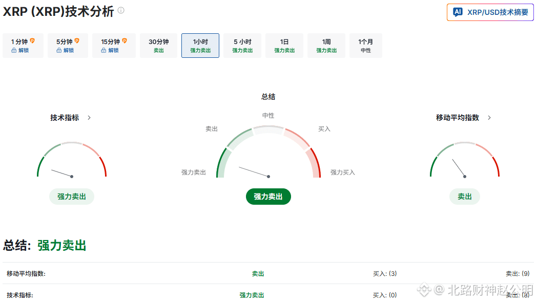 趋势全面看空:1小时、5小时、日线、周线全是“强力卖出”,移动平均线9个卖出对3个买入,技术指标8个卖出对0买入——这是空头的绝对统治区。