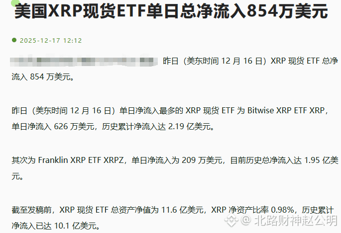 每天有850万美金真金白银通过ETF买入XRP,累计净流入已超10亿美金——这确实是长期利好,说明机构认可XRP的现货价值。但注意两个细节:一是净资产比率仅0.98%,在ETF家族里还是“小弟”;二是这种机构慢钱,往往抵不住散户和杠杆资金的短期踩踏。简单说:ETF托底,但不一定能立刻拉升。