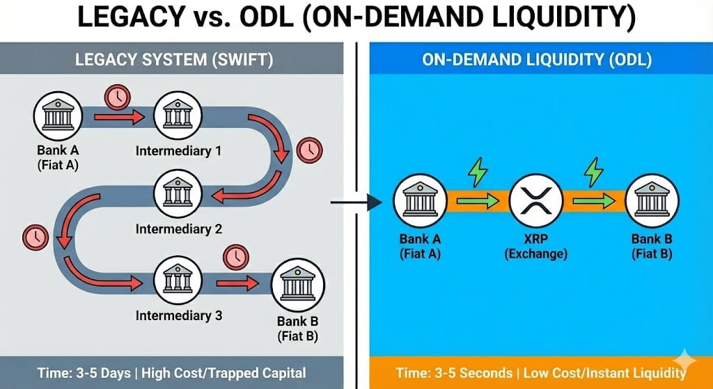 To understand the intrinsic value of XRP, we need to dissect the concept of ODL (On-Demand Liquidity). In the traditional banking system (the Nostro/Vostro legacy), banks need to keep trillions of dollars "sleeping" in accounts around the world just to pre-finance future transfers. This is dead capital.