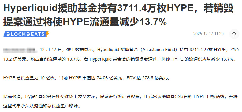 Hyperliquid Assistance Fund holds HYPE tokens worth $1.02 billion, accounting for 13.7% of the circulating supply. The official vote is to burn it all! If passed, this would be an epic deflation, theoretically super rocket fuel.