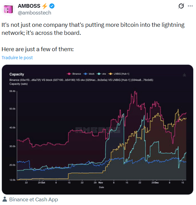 This increase is partly due to the growing integration of the Lightning Network by crypto giants like Binance or OKX. These centralized exchange platforms (CEX) have indeed deposited more bitcoins on the LN network this month.