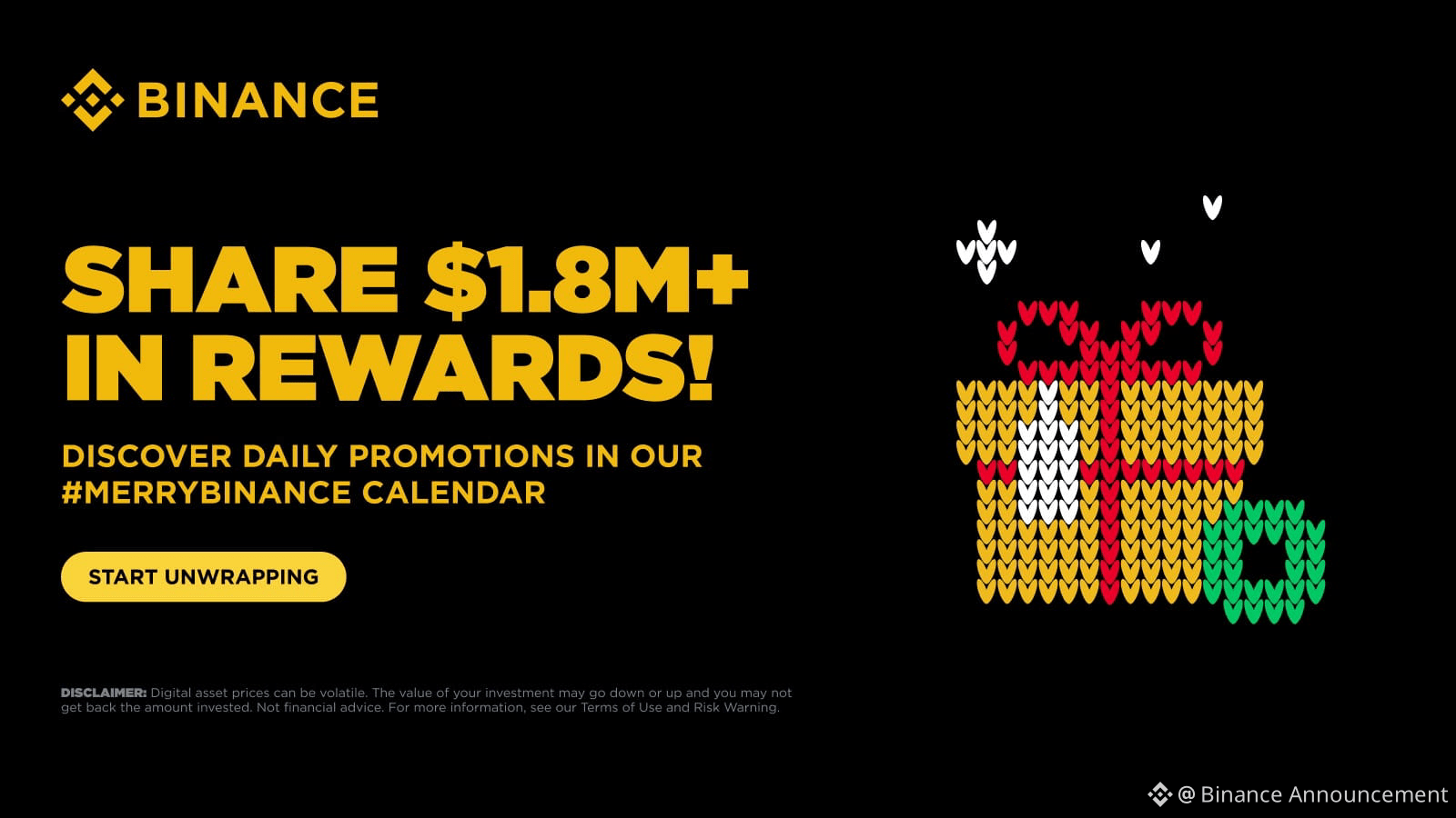 The countdown to Christmas is on! From now until Christmas Day, all users can log in to the #MerryBinance Calendar daily to discover a myriad of festive promotions and delights, sharing in over $1.8M worth of rewards.