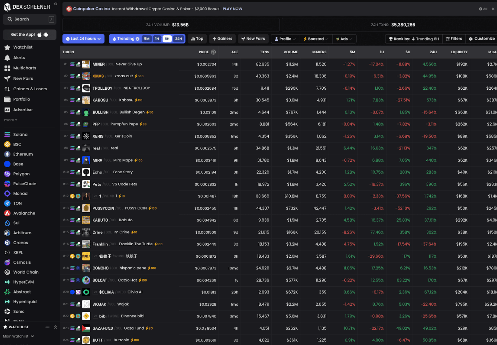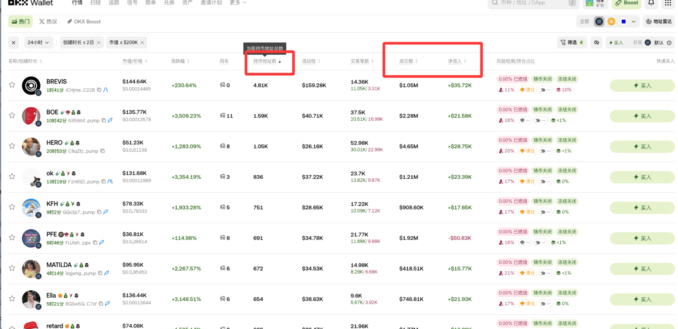 For example, when filtering on DexScreener, select a market cap of 30K - 10M USD (too low is easy to run away, too high is hard to double), liquidity must be greater than 10,000 USD (to avoid high slippage), and the number of holding addresses must exceed 1,000.