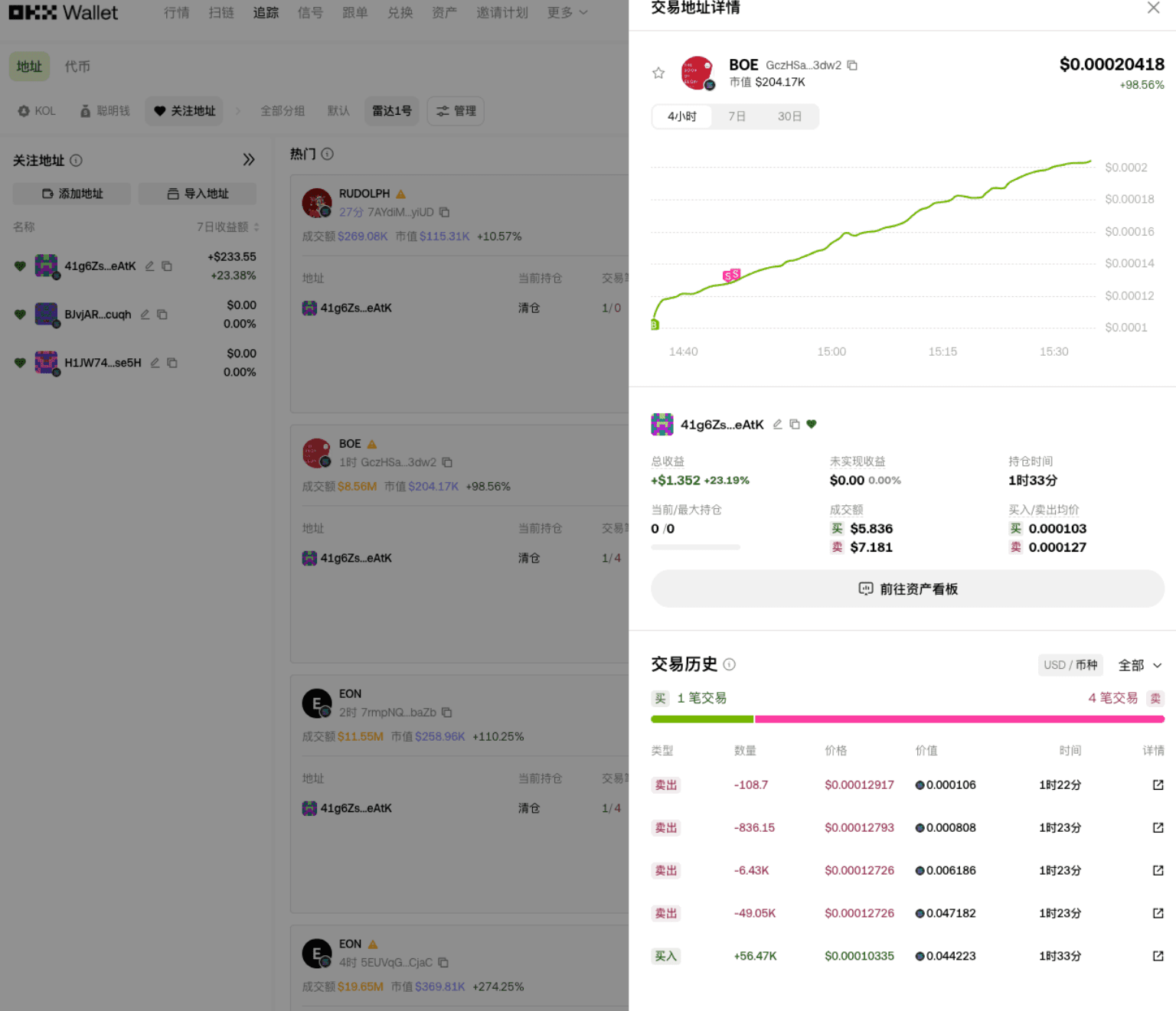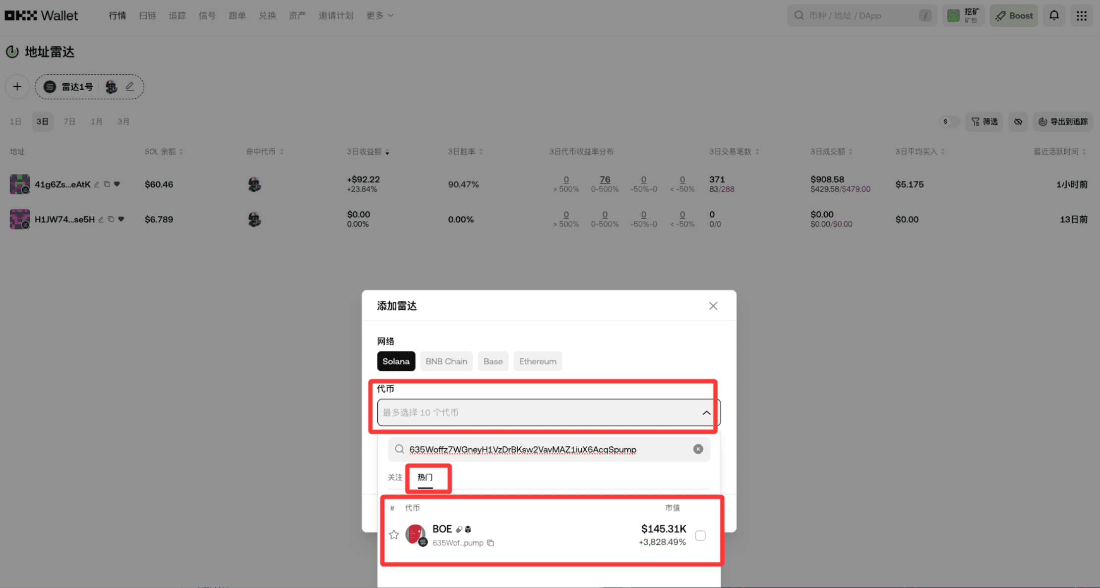 Next is the second core technique: use address radar to find smart money. Let's take the BOE coin we just filtered as an example and show you in practice! Enter the address radar from here, find BOE, select it, give it a memorable name; the last time it was called Radar No. 1, this time let's call it Radar No. 2, and see if we can dig up treasure addresses again.