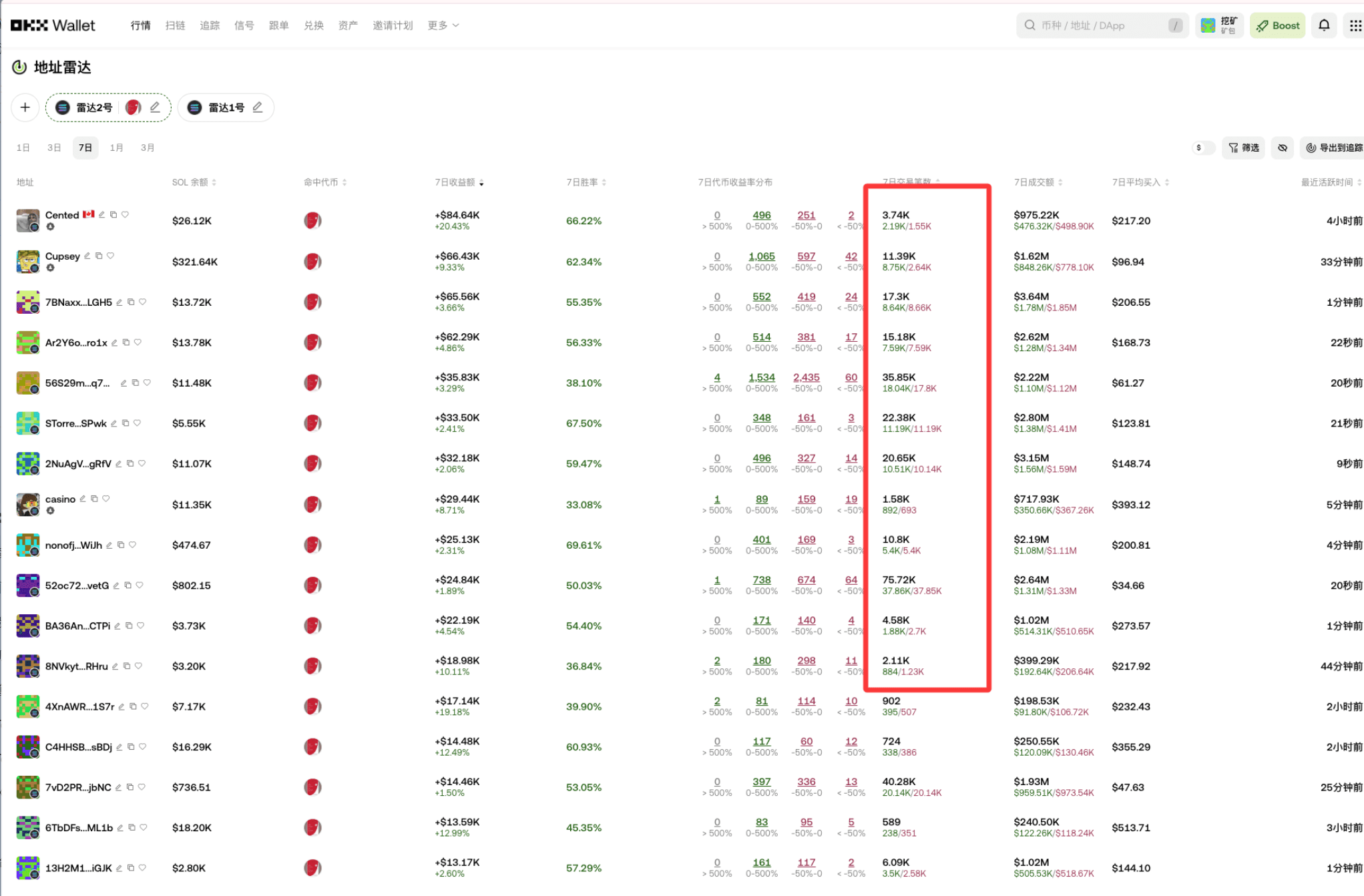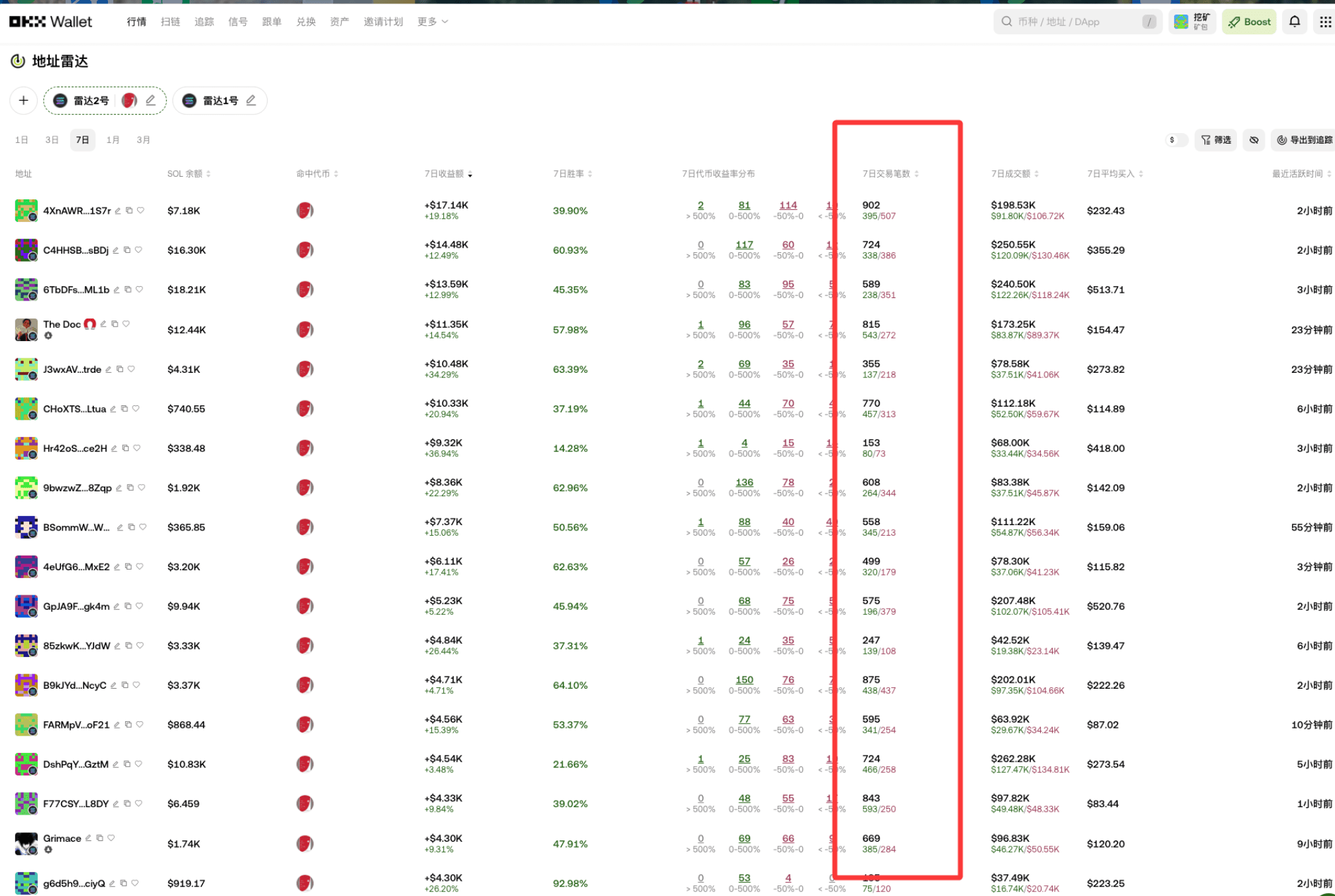 The first step is to exclude bots and wash trading. Addresses that make thousands or even tens of thousands of trades within a few days, especially those marked with a 'K', are all arbitrage bots. They don't have depth in trading, only making small profits, so they are not worth tracking.
