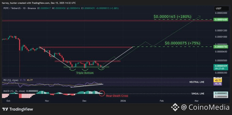 PEPE might be on the verge of a bull rally after a double bottom pattern evolves into an even stronger triple bottom reversal structure.