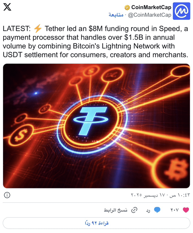 Cryptocurrency payments today have moved beyond speculation and the noise associated with trading. Practical usage continues to grow among the retail sector, creators, and e-commerce. Tether has taken a step to accelerate this shift through a targeted investment, leading an $8 million funding round in Speed, a rapidly growing payment platform.
