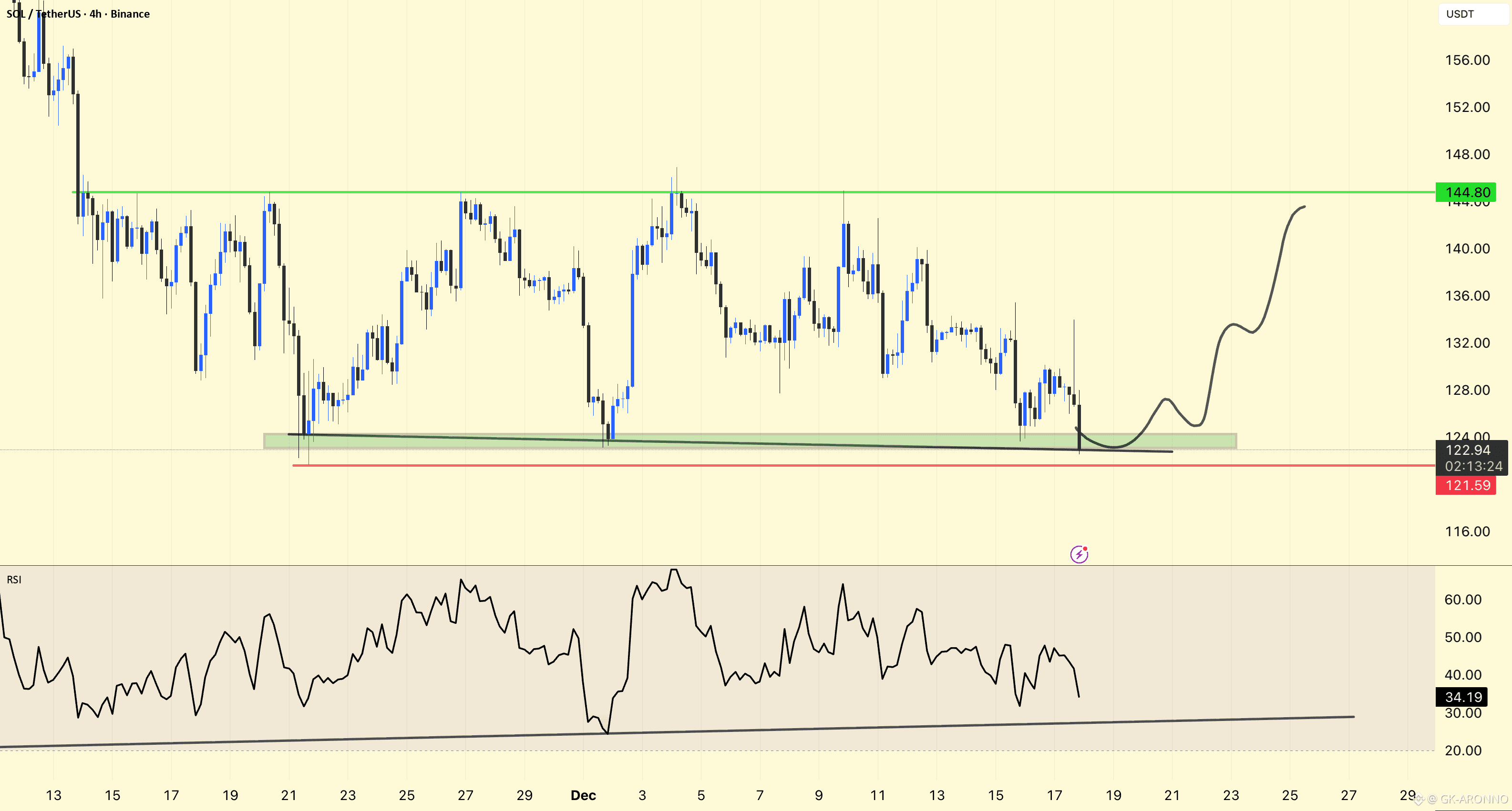 SOL is currently trading within a high-probability demand zone (123–121) that has been tested multiple times. Price compression at this base suggests that sellers are exhausted, and an upward reaction is likely.