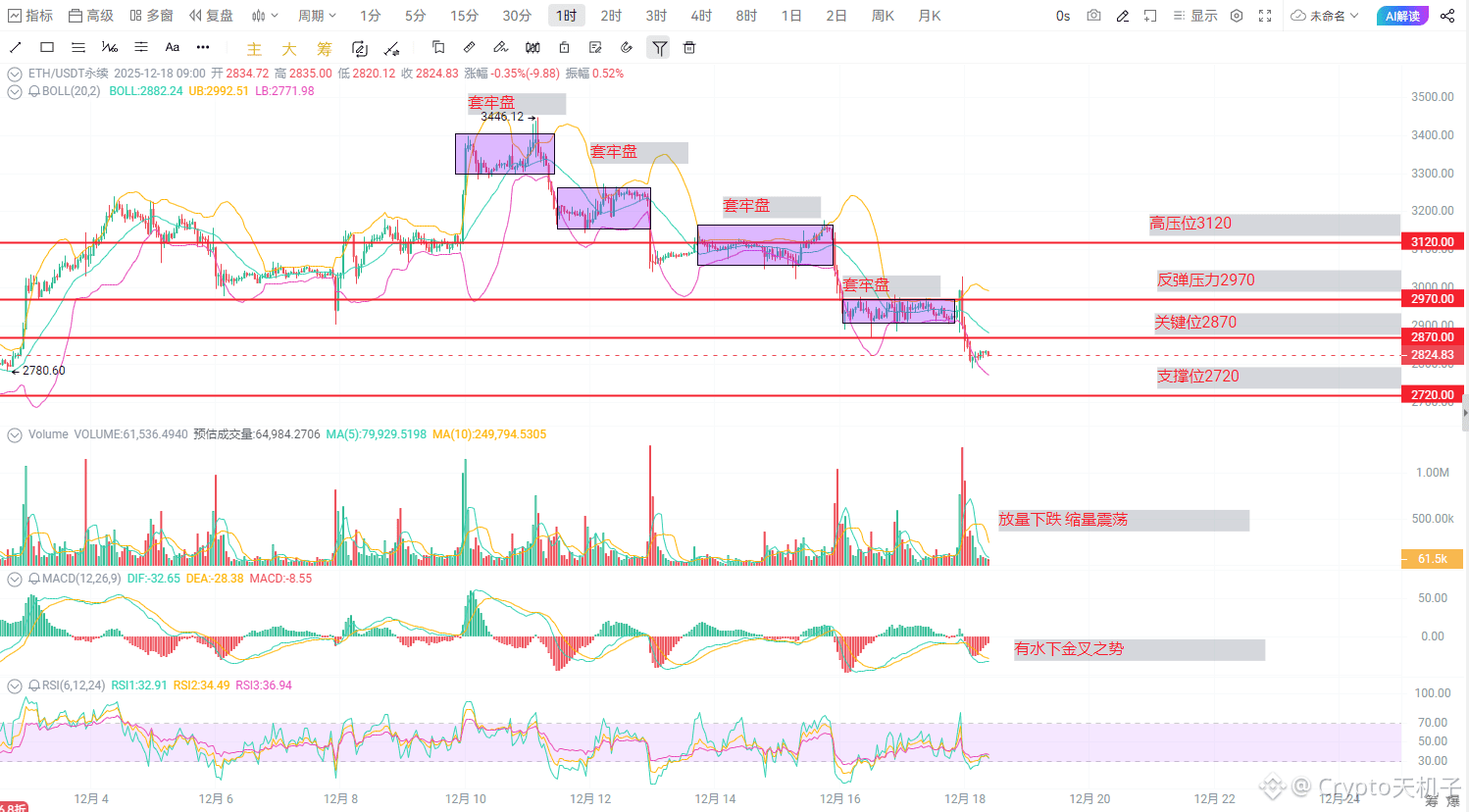 从昨晚的走势可以看出,ETH现在情绪非常弱势。一旦美股继续回调,ETH很可能会再次破位下行。而且从箱体历史来看,每次破位后的跌幅都不小,下一个关键支撑在2700-2750区域,甚至不排除测试2600的可能。