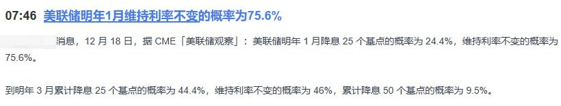 On December 18, according to CME's 'Federal Reserve Watch' data: there is a 75.6%! probability that the Federal Reserve will remain unchanged in January, keeping interest rates steady. By March next year, the probability of maintaining interest rates will still be 46%!