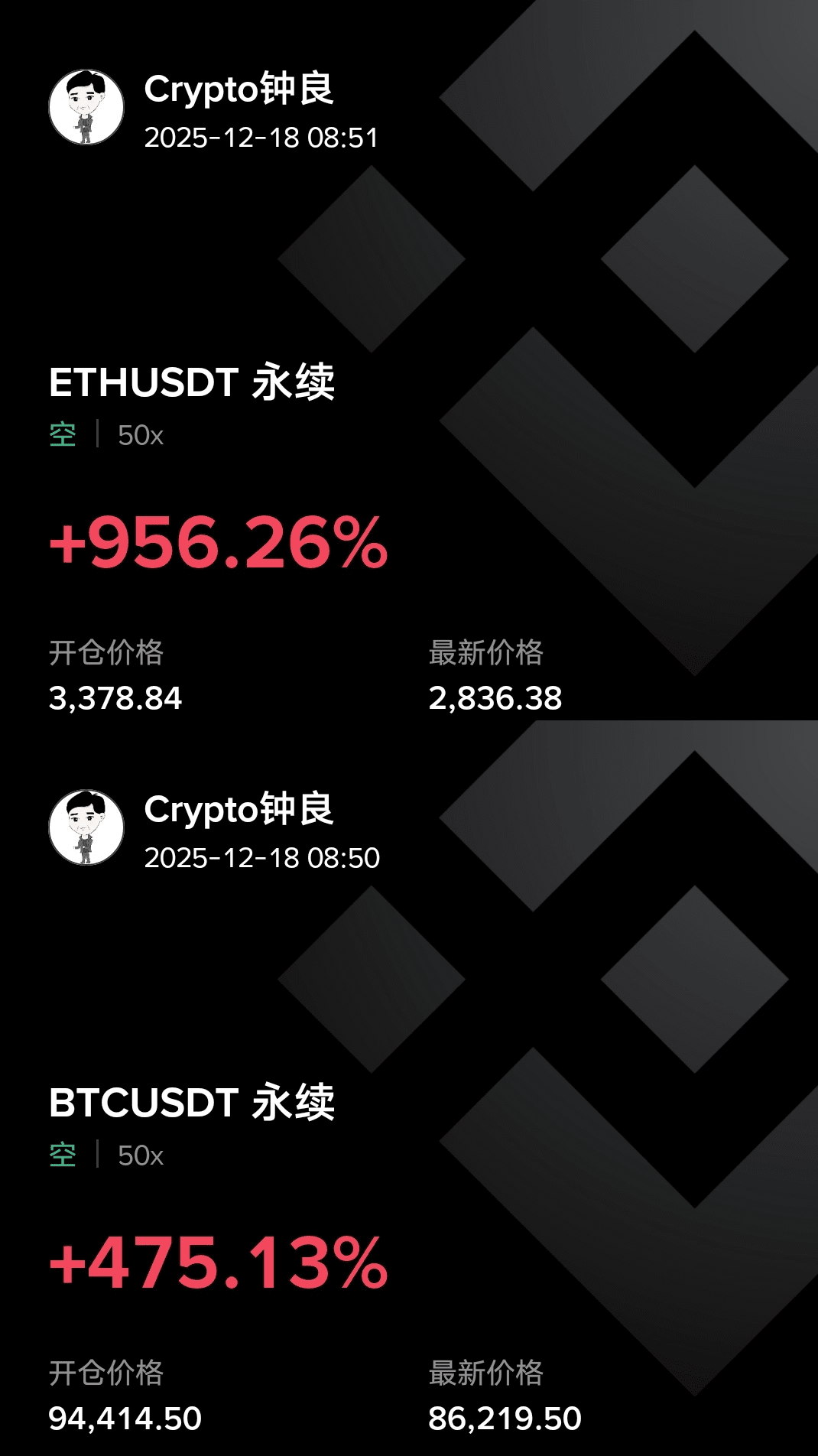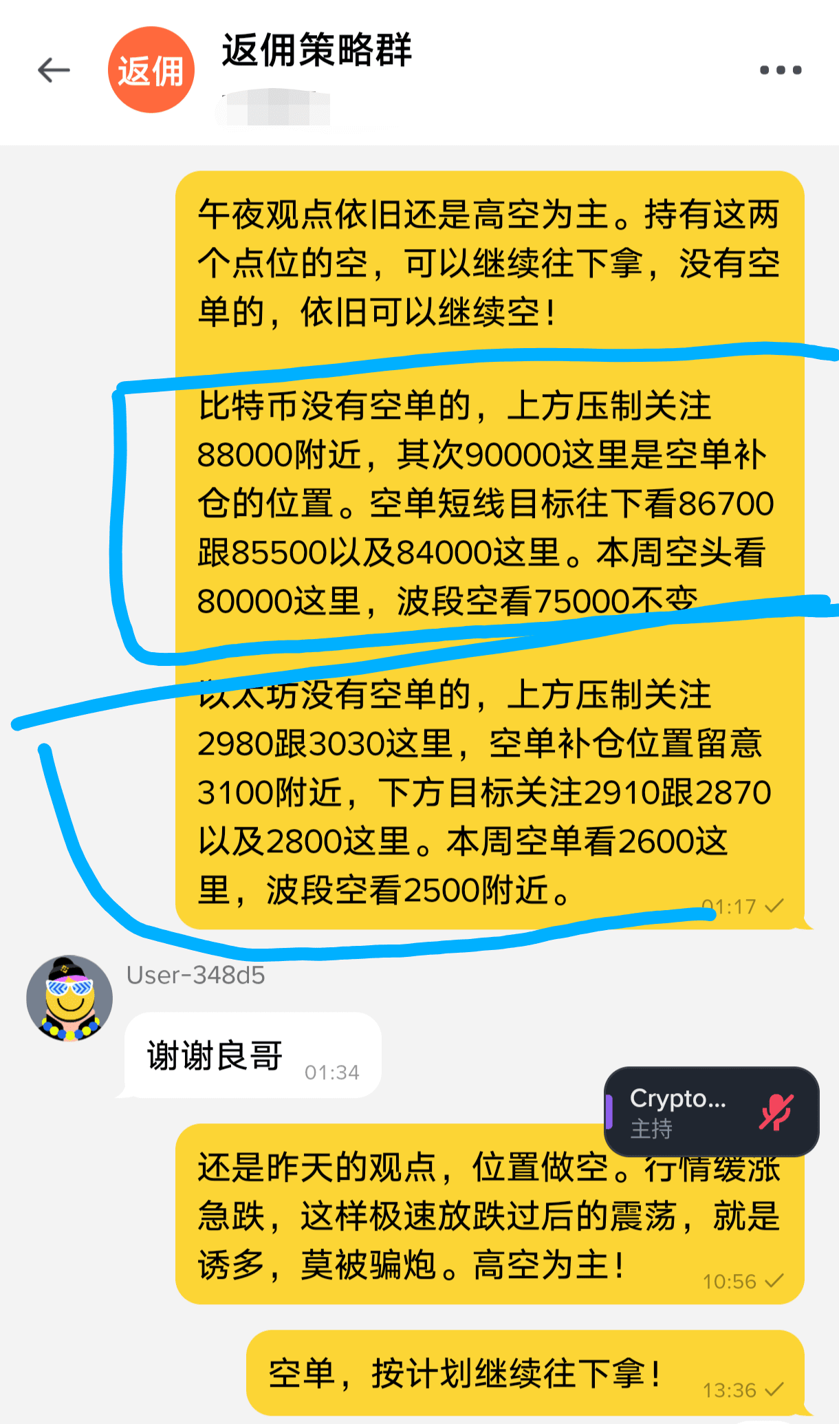 Good afternoon, the high point yesterday was quite thrilling and refreshing, wasn't it? Bitcoin has kept an eye on suppressing 88000 and 90000, while Ethereum has focused on 2980 and 3030 high points. In the live stream, we advised short positions at 86000 and 2800 here, and they have also reached their targets. One trade made 2000-4000 points, and Ethereum made 180-230 points. For intraday short positions, that should be considered decent, right? For those who missed out, don't feel disheartened; there will be opportunities today as well. The shorts from last week at 94400 and 3380 are still in hand. Looking down, the weekly targets are 80000 and 2600, and for swing positions, keep an eye on the 75000 and 2500 lines. Hold steady, stay firm, and if you can't hold on, come back and read Zhongliang's articles and watch the live streams daily; you will definitely gain something! Thank you all for your constant support and companionship. The much-anticipated yellow V has also been arranged, which reflects everyone's cohesion and is the driving force that continually motivates Zhongliang to forge ahead!