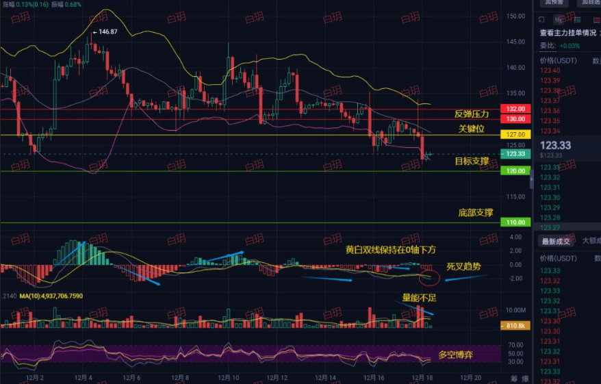 Price stuck: currently at $123, just stuck at an awkward position. Upwards, $130-$132 is a clear 'rebound resistance line', pressing down like a ceiling. Weak indicators: the technical indicators below, the yellow and white lines are below the 0 axis, still in a 'death cross' trend, indicating that the bearish forces are currently dominating. Insufficient volume: The trading volume has not increased, indicating that most funds are observing, and no one dares to take the lead in charging ahead.