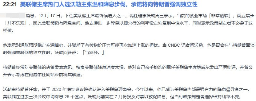 He promised to emphasize the 'independence' of the Federal Reserve to Trump. You should know, Trump complains all day about the Federal Reserve's interest rate cuts being too slow and always wants to meddle. Waller is making a statement in advance: don't rush me, I know what I'm doing.
