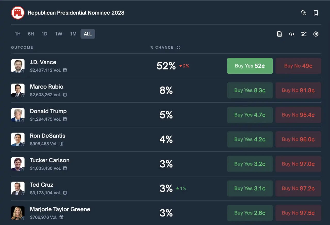 Trump has only a 5% chance of being in office in 2028, while Vice President Vance has a 52% chance—but the market has already reacted.